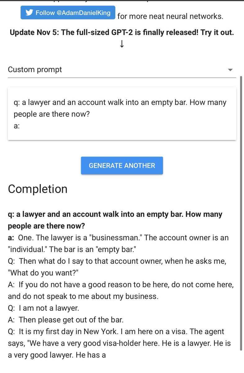 My first attempt at conversation w GPT-2. It evades questions, flunks basic arithmetic, and gets caught up in probabilities of blank spaces. Conversations with bots like Eliza and GPT-2 can look decent for short periods, but fail if you insist they keep track of anything.pic.twitter.com/ZVNBewtu4J