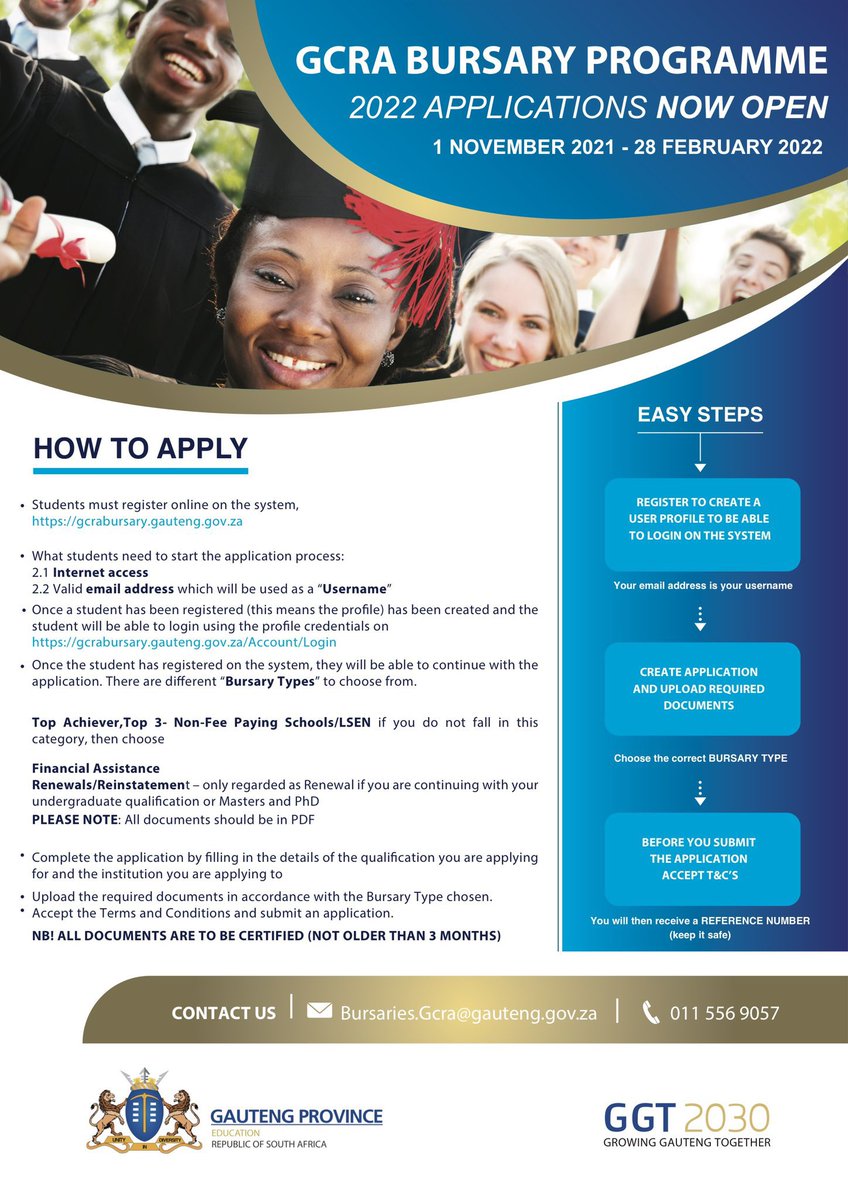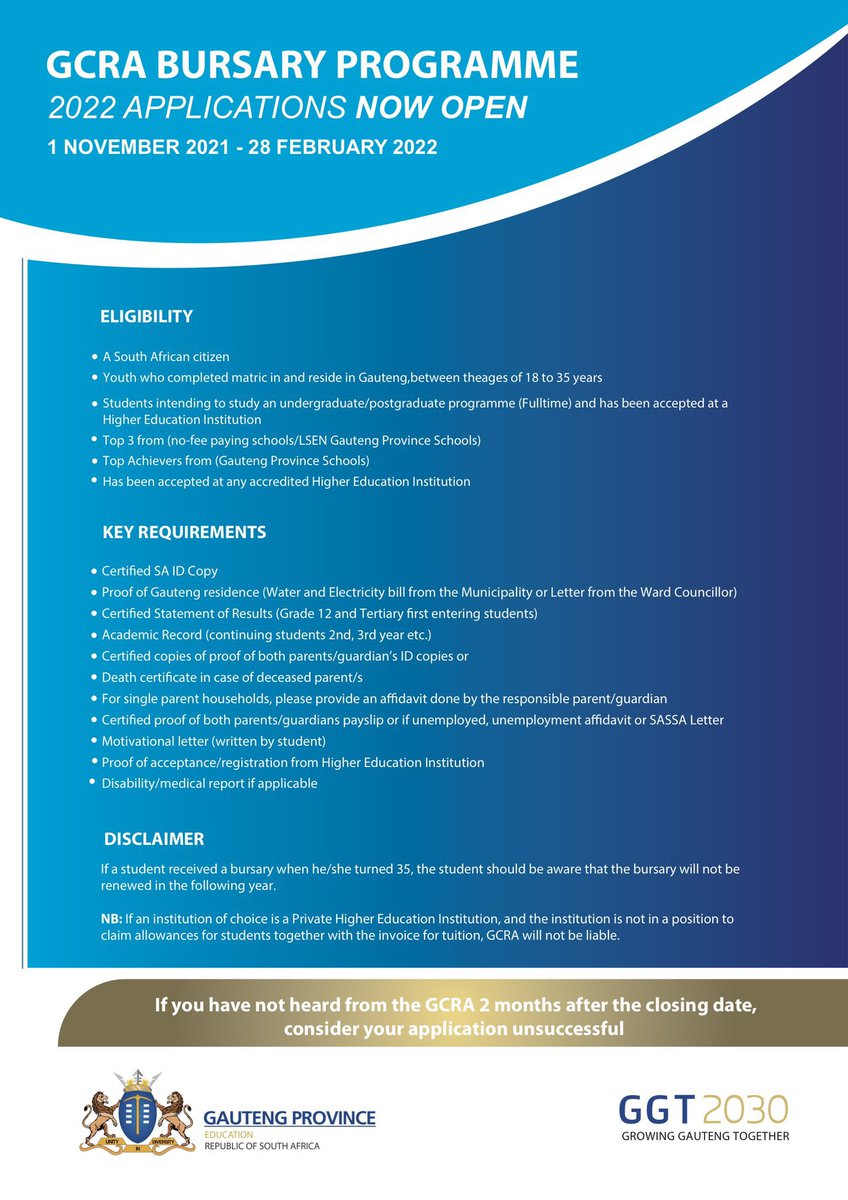 The Gauteng City Region Academy (GCRA) Bursary continues to help equip our youth for the future. Eligible youth in Gauteng are encouraged to follow the criteria below and apply before 28 February 2022. To apply, visit: http://gcrabursary.gauteng.gov.za Apply Now!
