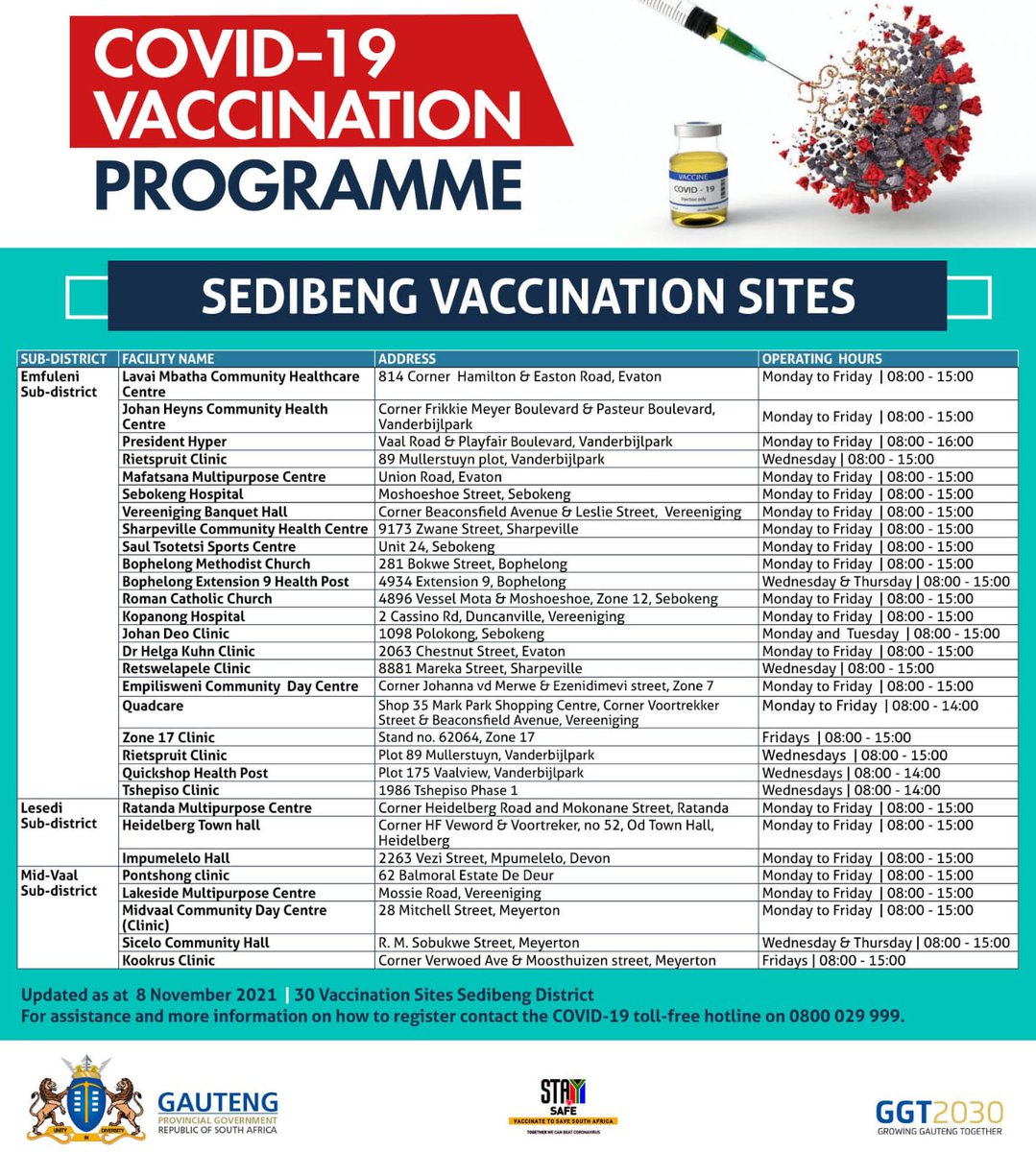 Gauteng updated weekly vaccination list for West Rand. All eligible persons are encouraged to visit their nearest vaccination site and get vaccinated. Walk-ins are accepted whether people are registered on the EVDS or not