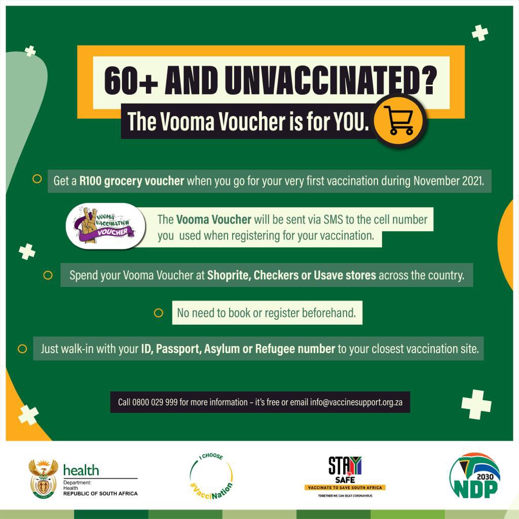 #VoomaVaccination voucher valued at R100 to spend at@Shoprite_SA,@CheckersSA or USave, within 30 days.#VaccinesSaveLivespic.twitter.com/LX8z7VGrP6