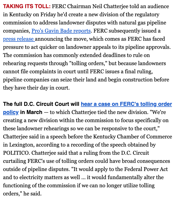 Timing for the hearing is great, given that FERC just announced a new agency division on pipeline landowner issues and the full D.C. Circuit will take the issue at the end of March. From