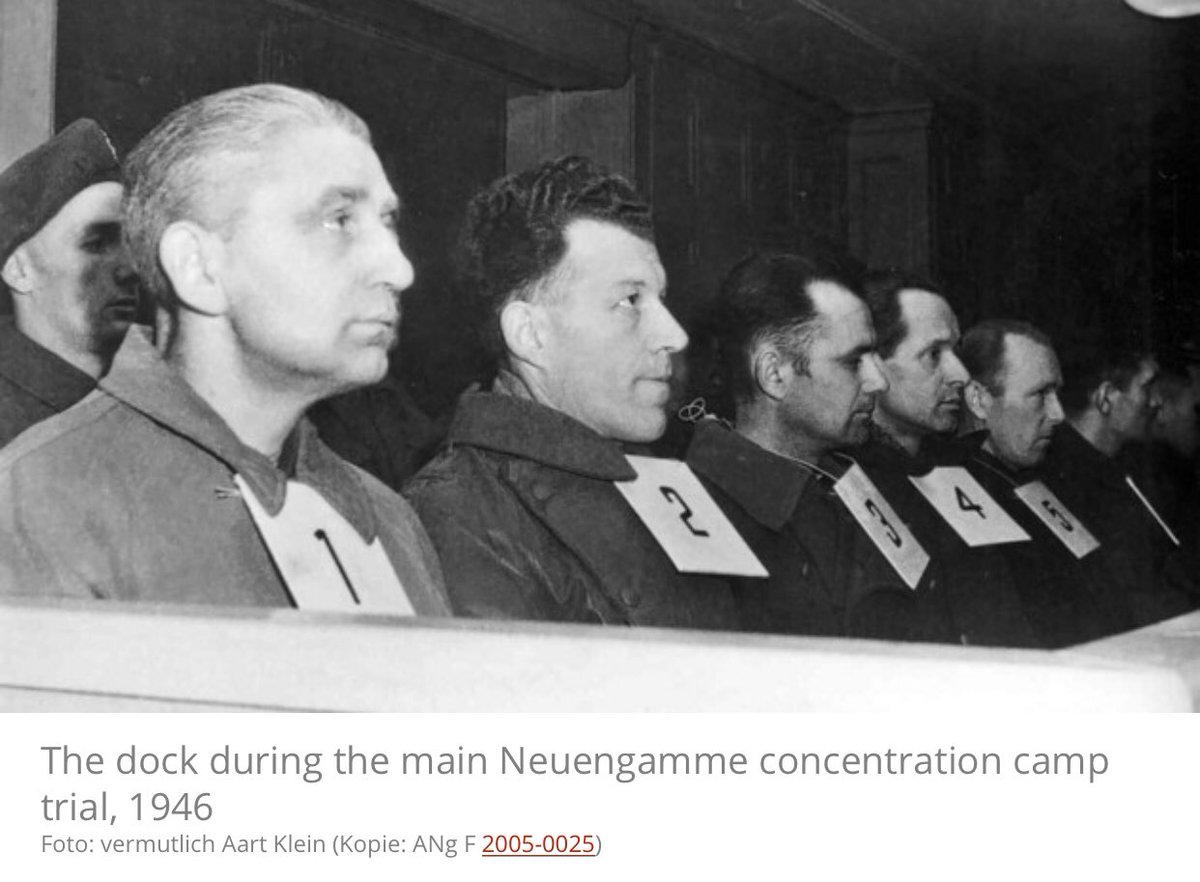 #Neuengamme fanden vor britischen Militärgerichten statt. Im ersten Prozess, der 1946 stattfand, waren 14 SS-Männer angeklagt. 11 der Angeklagten wurden zum Tode verurteilt, 3 erhielten Freiheitsstrafen.#75Befreiung#vorGerichtpic.twitter.com/cfftTul8v1