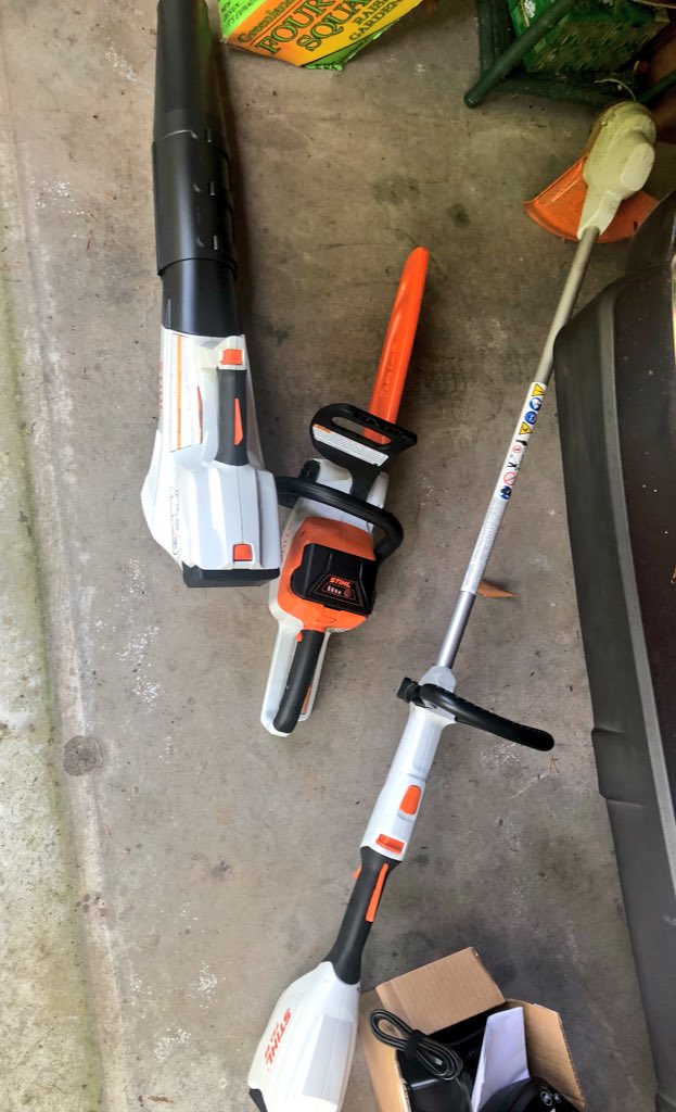 I purchased 3 battery powered @STIHLUSA implements... a weedeater, blower and chain saw... Well priced and really very cool stuff... Not for huge work loads of course but more capable then one might think... recommended ie the light weight blower on roof is much safer...pic.twitter.com/IspGzUOUcD