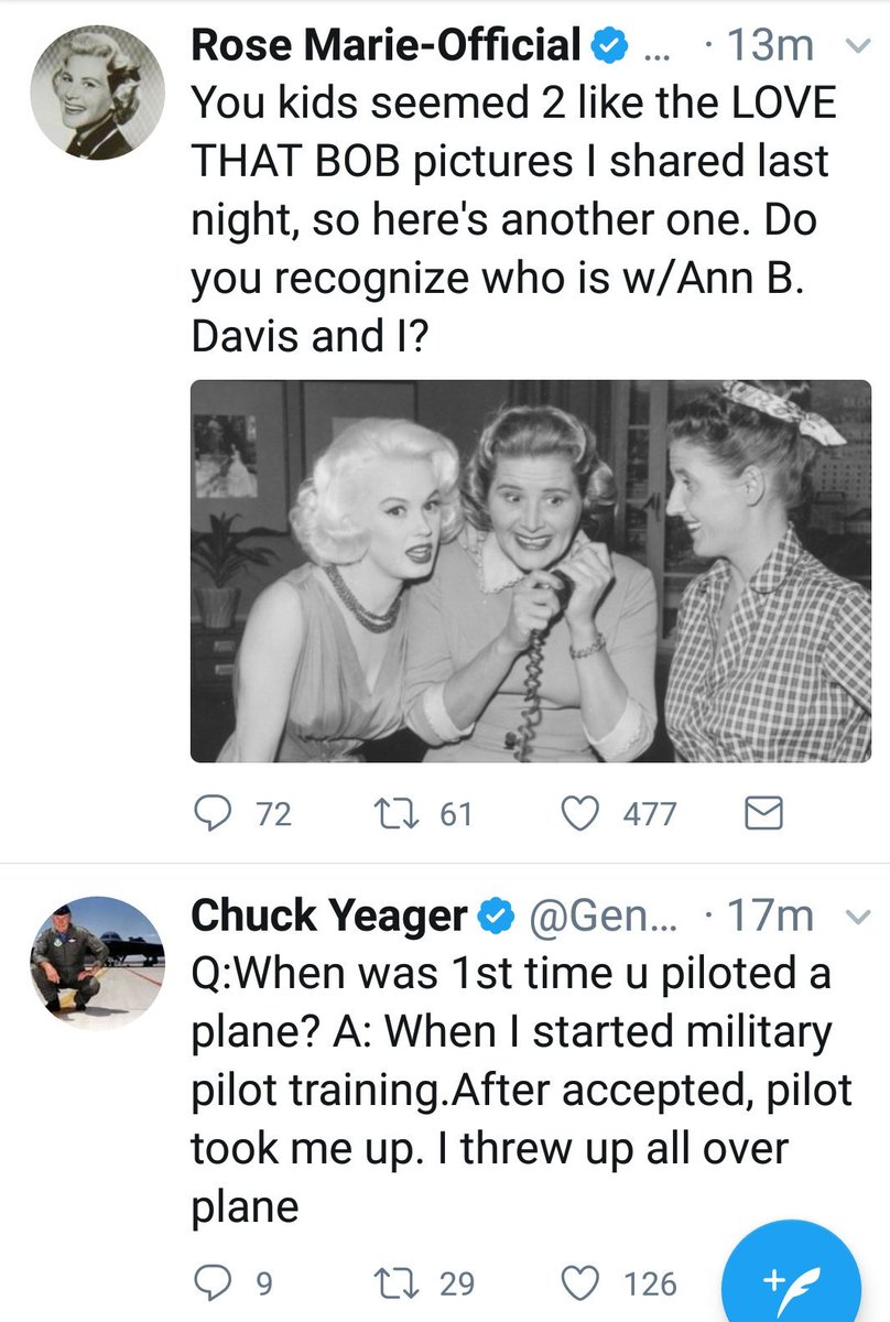 .@RoseMarie4Real and @GenChuckYeager are both 94 and crushing it on Twitter. Worthy follows.pic.twitter.com/VRobKWBDzH