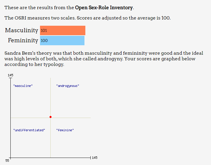I'm high at both feminine and masculine traits on the Open Sex-Role Inventory! I'm INTENSE-gender heeeeell yeahhh