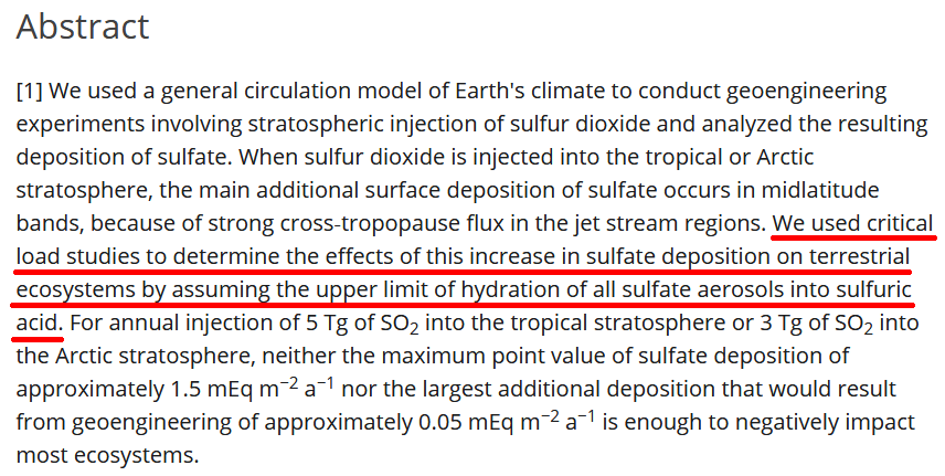 Also, the quote from Kravitz 2009 is taken badly out of context to make it appear that scientists want to pour the maximum amount of sulfuric acid onto ecosystems. In fact, it is about an assumption for the calculation to estimate the worst possible outcome.