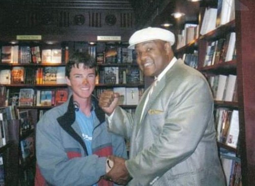 @GeorgeForeman at an airport bookstore in 2005 & he said I looked like he had finished 3 rounds with me. I said my mom liked his grills. And I had 2nd degree burns on my face from skiing without sunscreen. And I'm shaking his hand with the wrong hand.