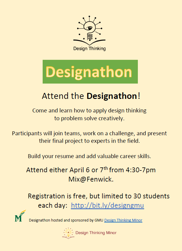 Come and learn how to apply design thinking to problem solve creatively. Build your resume and add valuable career skills. Attend either April 6 or 7th from 4:30-7pm Mix@Fenwick. Registration is free: http://bit.ly/designgmu For more info: http://bit.ly/2GBJulm