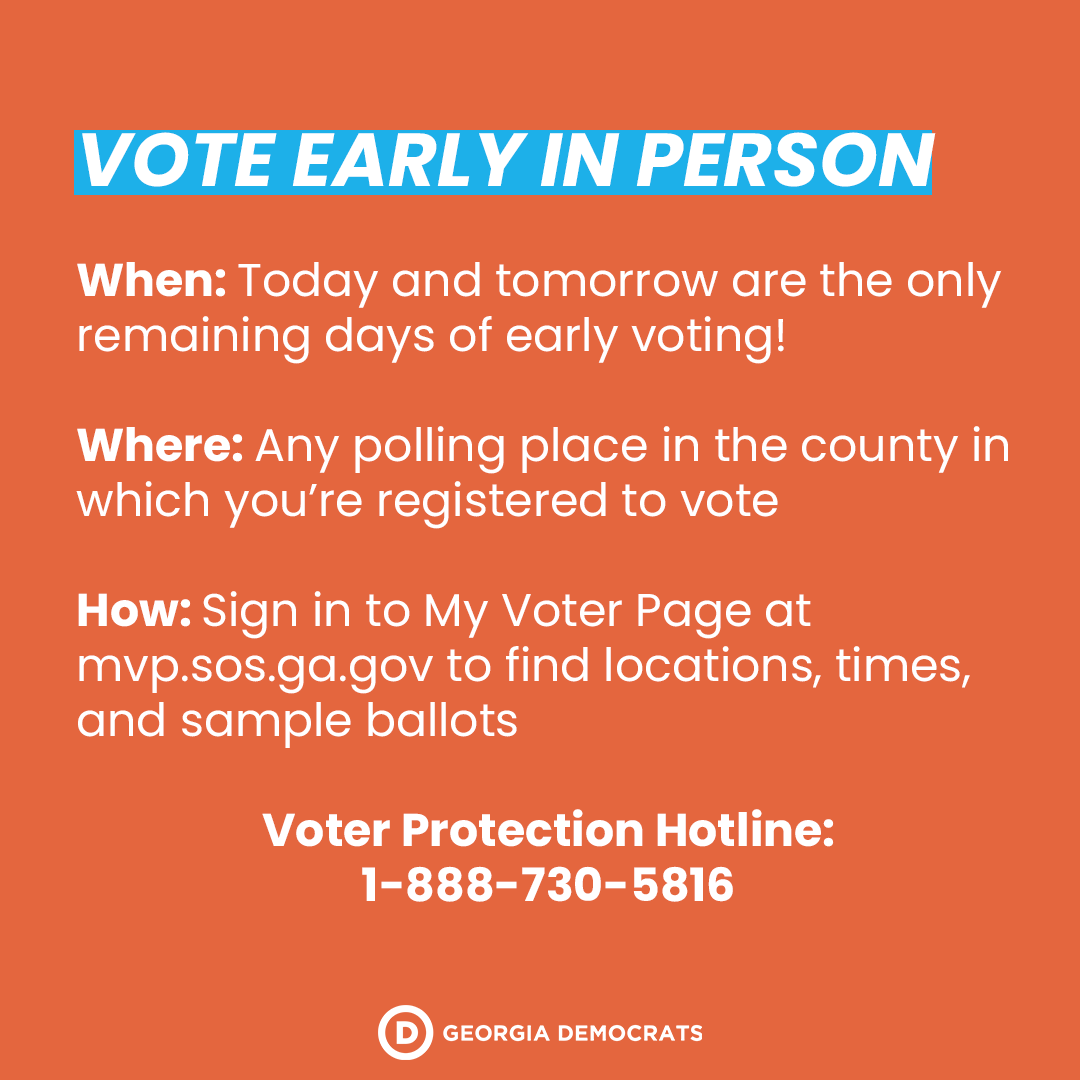 2 DAYS LEFT of early voting. Don’t delay, vote NOW. Go to http://mpv.sos.ga.gov to find polling places and hours, and call our voter protection hotline at 1-888-730-5816 if you need help.pic.twitter.com/E9dCPX5r7L
