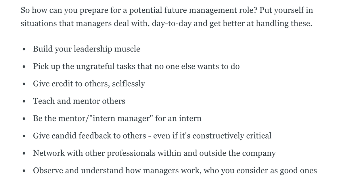 "I've been a dev for all my career - however, I'm thinking of changing to a leadership/management path down the line. What are things I can do now, to move into an EM role, eventually?" I'm writing up my thoughts, here's what I have so far. What additional advice would you give?pic.twitter.com/sVaiN0iQYy
