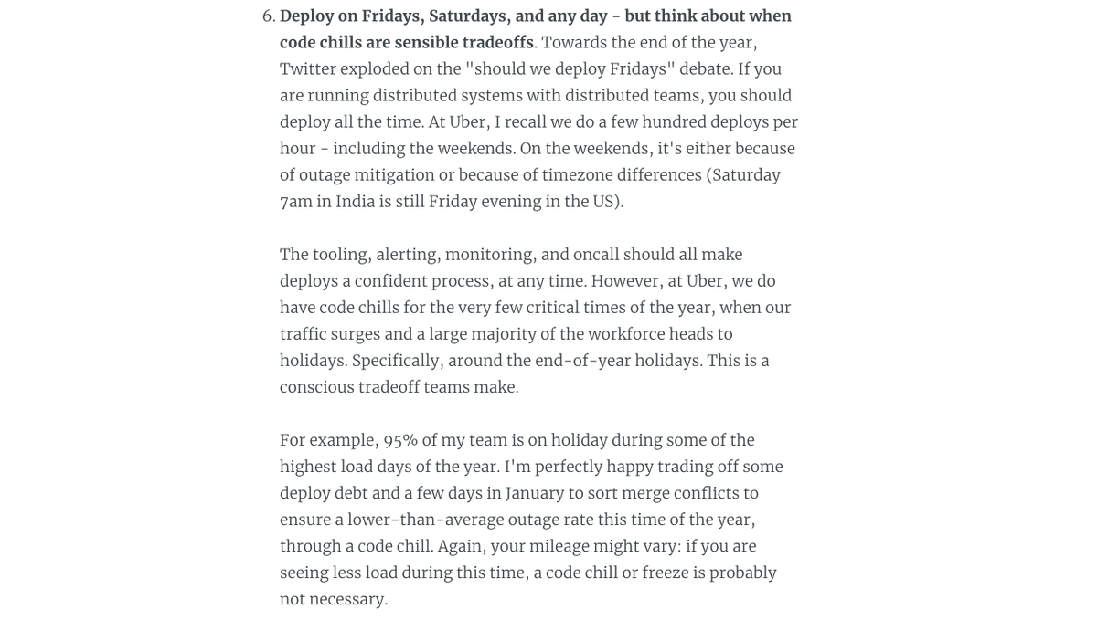 With the holiday code chill ending, it's time to pay off the lower-than-usual deploy debt: the price for a low outage holidays period. My team had a great holiday with fewer than average incidents during peak traffic, so this tradeoff was worth it for us. https://blog.pragmaticengineer.com/distributed-systems-learnings-in-2019/ …pic.twitter.com/81unlLm6wH