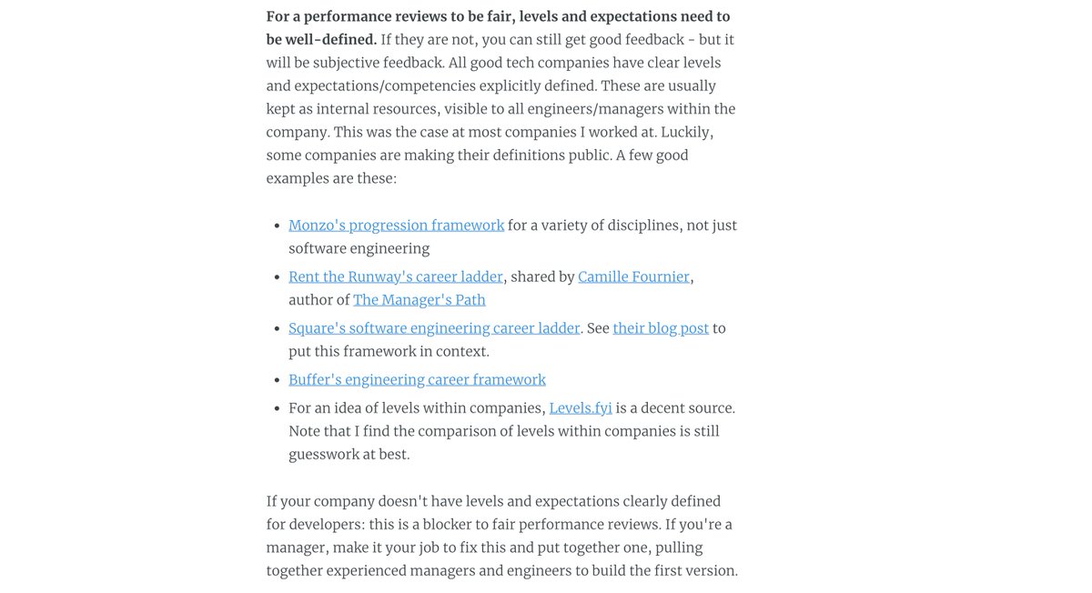 Key takeways, to sum it up: 1. Find the time 2. Be specific with feedback 3. Don't wait with feedback until perf reviews 4. People _really_ appreciate quality feedback 5. Good perf reviews build trust & help people grow faster The post itself: https://blog.pragmaticengineer.com/performance-reviews-for-software-engineers/ … (10/10)pic.twitter.com/pBjHBu4qvI