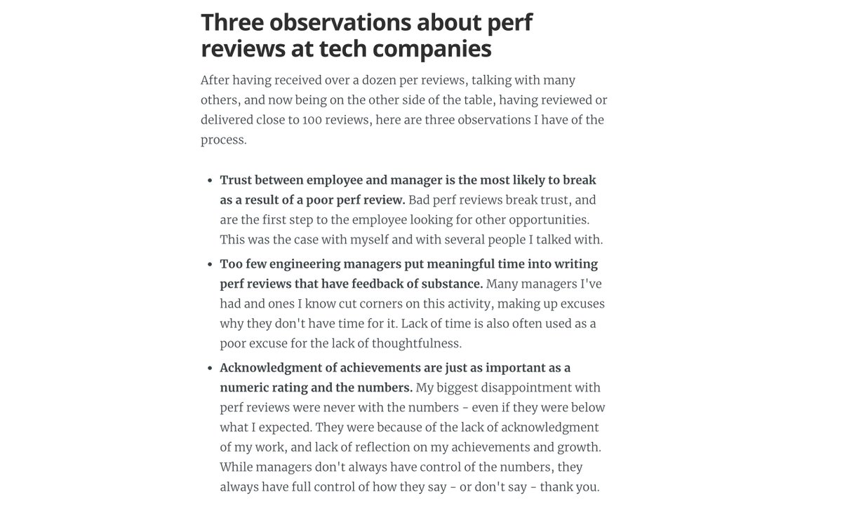 The problem with bad perf reviews is these break the trust, and are often mark those "shields down" moment. Also, too few managers put in meaningful time into reviews - at least that's how many people feel. And acknowledging good work isn't as common as it could be. (4/10)pic.twitter.com/iVIvjdxdAI