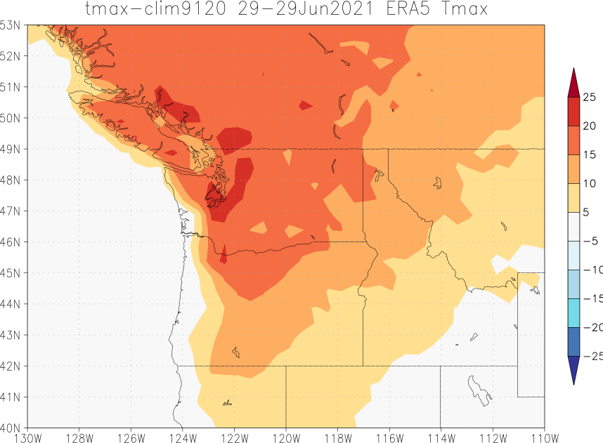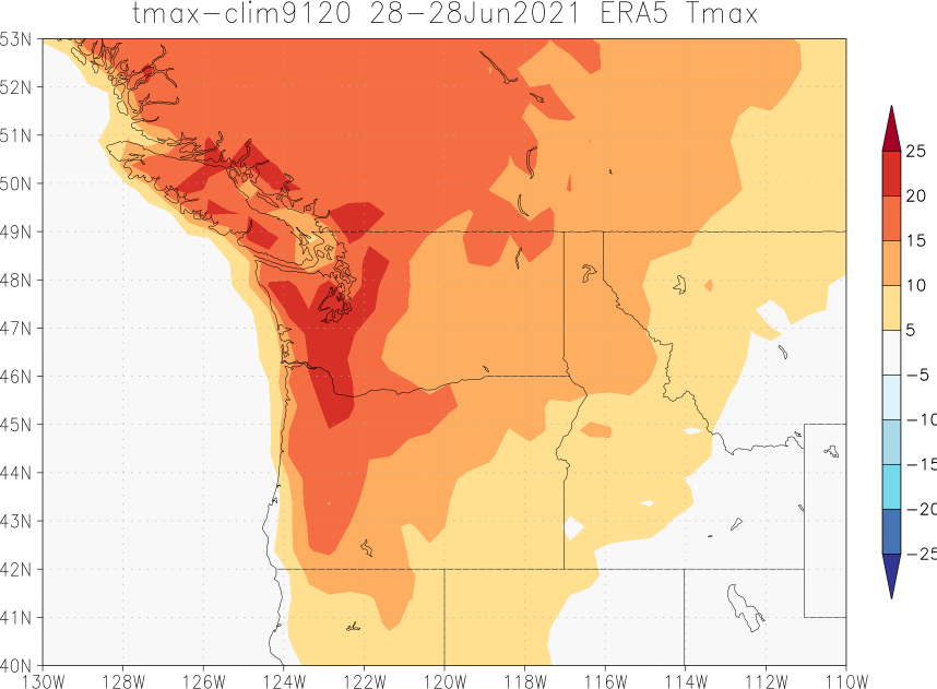 Crazy: 20 degrees Celsius anomalies forecast for Monday and Tuesday in the Pacific Northwest. (ECMWF forecasts interpolated to 0.5º compared to ERA5 1991-2020). Yesterday's forecast of 43 ºC for Seattle would already be far above the historical record of 39.4ºC. Today I see 44ºC.pic.twitter.com/RptMFXT6bG