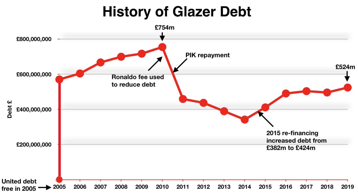 Debt -£525m In 2005 the club was sold for £790m. The Glazers took out a leveraged buyout loan (LBO) of £550m, transferring the debt liability onto the club. Today, the gross debt is £524m. In nearly 15 years, only £25m of the debt capital has been paid.pic.twitter.com/pvwyG1uC5G