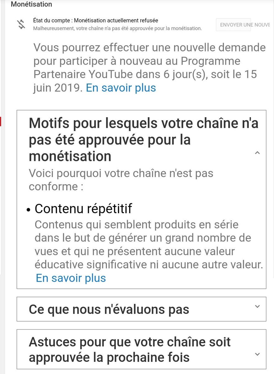 Merci pour ces captures d'écran. On vous conseille de refaire une demande de participation au Programme Partenaire YouTube le 15 juin prochain. D'ici là, on vous invite à consulter cet article qui vous donnera des conseils pour améliorer votre contenu : https://yt.be/help/sX4M .