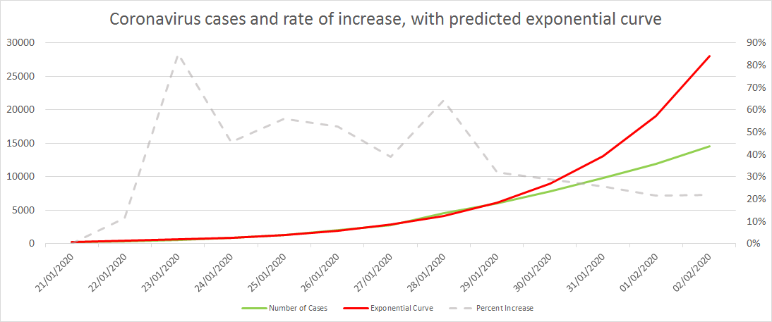 One thing that's really supporting the reasonable caution angle is the rate of increase in cases - it was exponential to start off with, but is now declining quite rapidly in China and across the worldpic.twitter.com/DMRxR6bRYJ