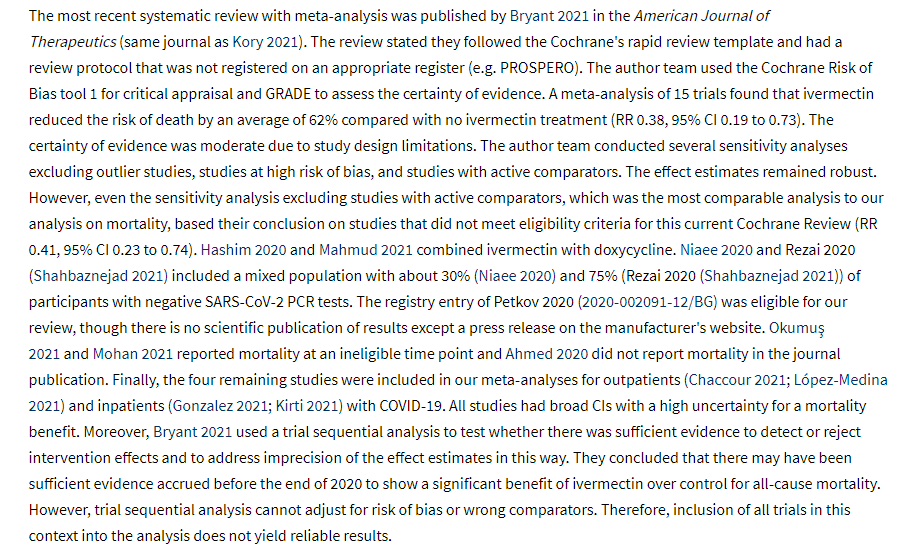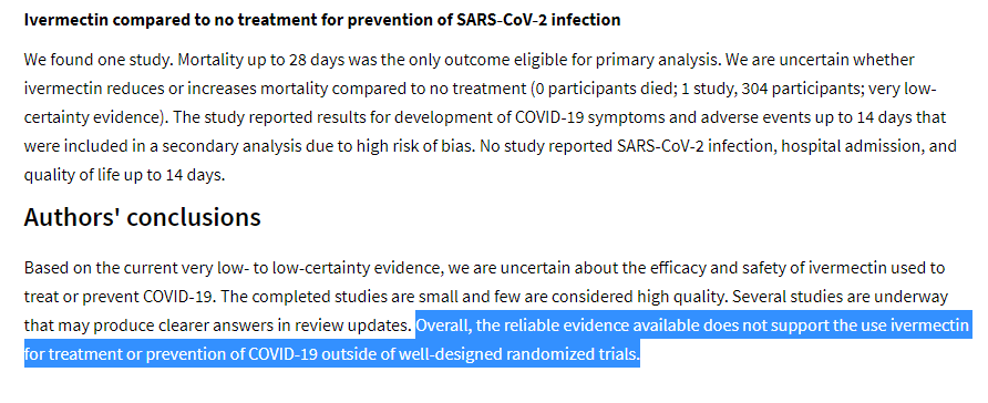 12/n I think that the Cochrane review into ivermectin remains solidly the best evidence around, arguing that we should only be using the drug in the context of a clinical trial until we have better evidencepic.twitter.com/PA5h7p5pTg