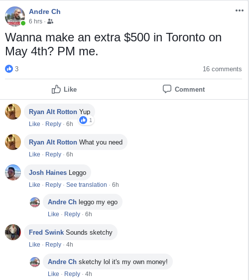 Andre Ch, a member of pegida's ~security team~ offered people $500 to show up to the anti-Muslim rally in Toronto tomorrow, but let's hear more about how anti-fascists are pAiD pRoTeStErS 😂 pic.twitter.com/781SC3sLsW