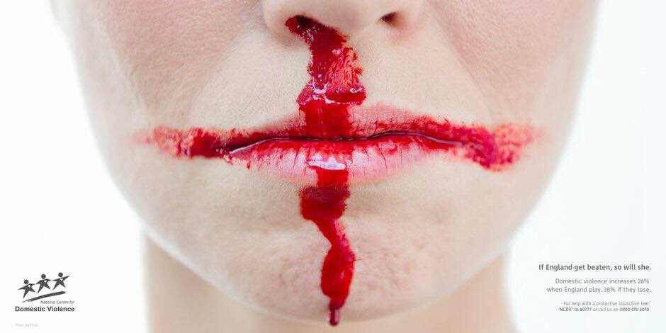 "If England gets beaten, so will she." Domestic violence increases 26 % when they play. 38 % when they lose. Extraordinary poster campaign in the UK, by NCDV.pic.twitter.com/SUMFxKLH6V
