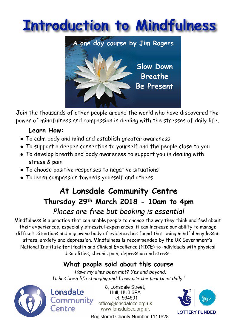 Don't forget to book your place on Jim Rogers' mindfulness day-course, it's free.. and takes place at Lonsdale on the 29th March, 10am til 4pm.. early booking is essential.pic.twitter.com/ZbptSnZJtX