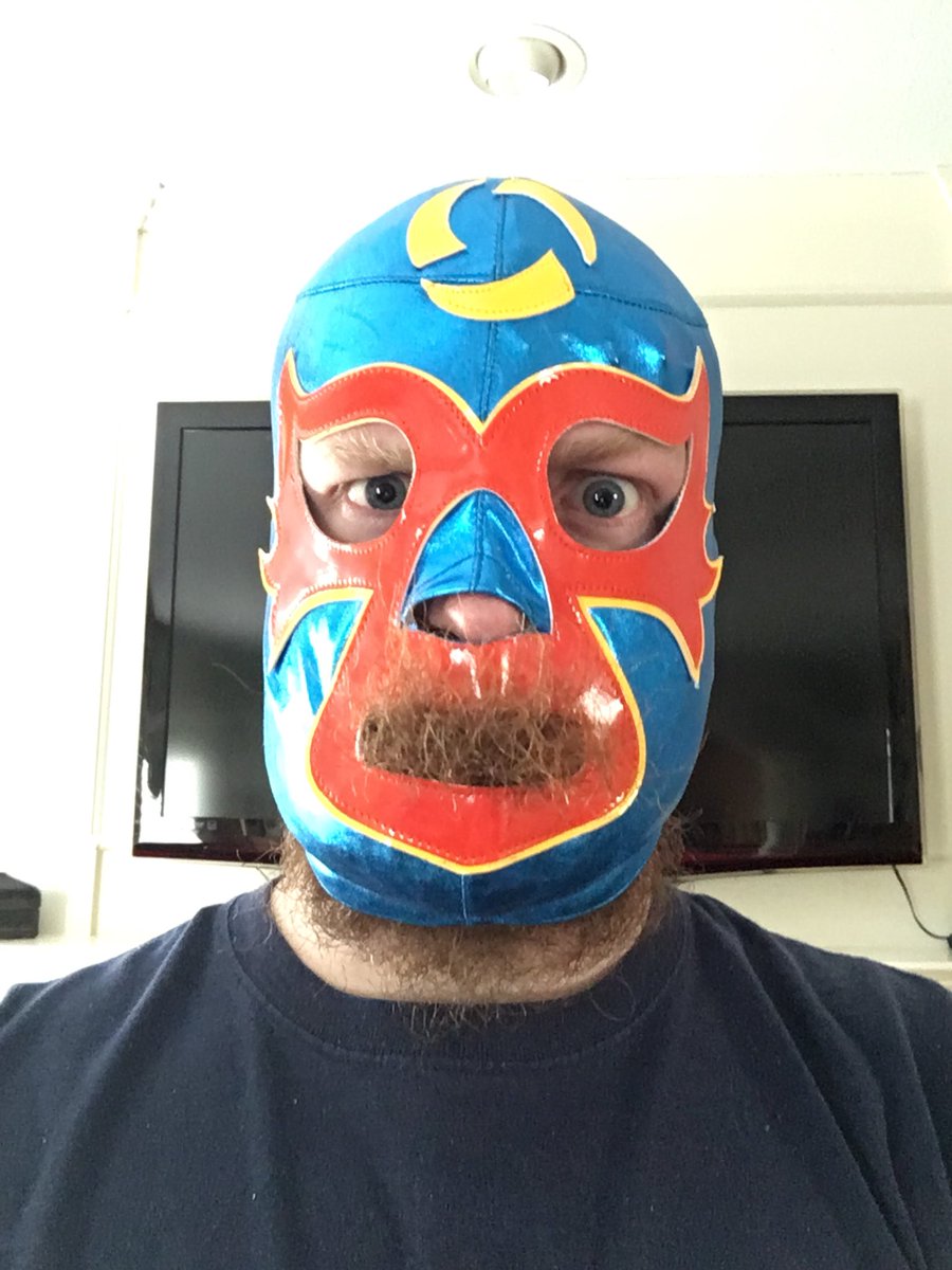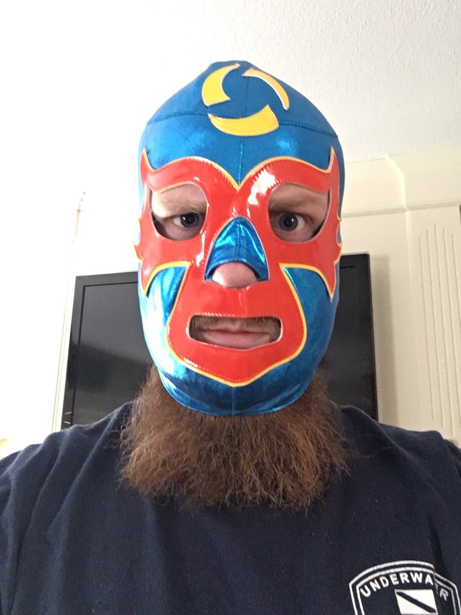 My Nexomania luchador mask finally got here! Thanks @BlizzHeroes! I’m not quite sure how the correct way to wear it with a beard is though...