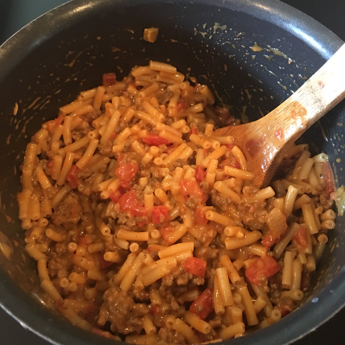 Decided to just see what I had to throw in some Mac and cheese. Diced tomatoes, green chili, leftover taco meat and Siracha. Not bad!pic.twitter.com/DF0ds7MApr