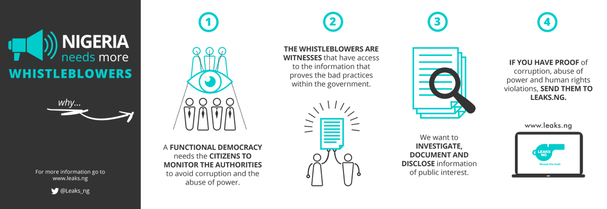 The importance of whistleblowers in Nigeria cannot be over emphasized. Whistleblowers play an important role in our 'democratic' form of government by exposing corruption on many levels. Use the description below for further guidance.
