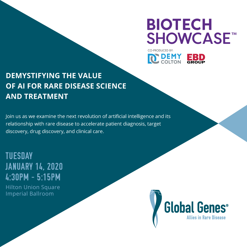 At #JPM2020? Head over to the #BiotechShowcase at 4:30 pm PT today as we discuss #AI's role in #raredisease drug discovery and treatment. #2020RITS @EBDgroup @demycolton