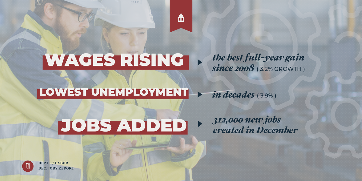 The economy is growing at 3%, job gains are huge (312,000 in December), manufacturing is growing, and wages are up. The December jobs report is more good news for families, small businesses, manufacturers, and our country.pic.twitter.com/CIktA8LOQM