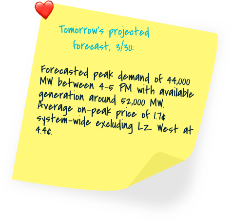 Tomorrow's projected forecast, 3/30: Moderate temperatures which should significantly bring down demand from levels seen this week. Wind generation is expected to be in excess of 12,000 MW through which should ensure the supply stack has more than sufficient generation capacitypic.twitter.com/DmvDujgNZ4