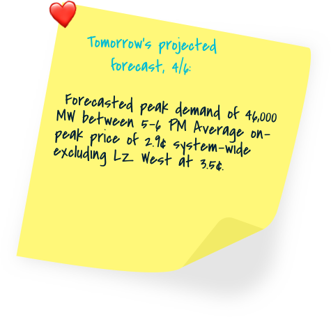 Tomorrow's projected forecast, 4/6: Hotter temperatures will increase cooling demand. Wind germination is expected to be around 7,000 MW during ht evening peak. Slight elevated pricing between 4 -7 Pm expected with hourly settles as high as 7¢.pic.twitter.com/9Q0dKepOT9