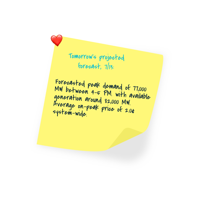 Tomorrow's projected forecast, 7/13: Anticipated to be one of the strongest demand days of the year, with demand expected to go above 77,000 MW. Wind gen. expected to come in strong with gen. around 18,000 MW during the evening peak.pic.twitter.com/LcOPQKY67v