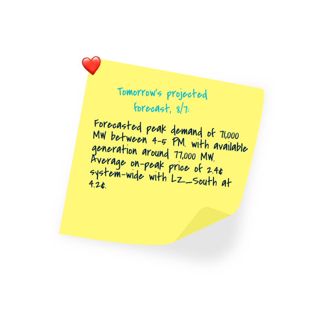Tomorrow's projected forecast, 8/7: LZ South continues it price premium due to transmission congestion. Expect two see an on pea average that is at least 2¢ greater than the rest of the system. Pricing elsewhere remains moderate.pic.twitter.com/DVwPLOh6b7