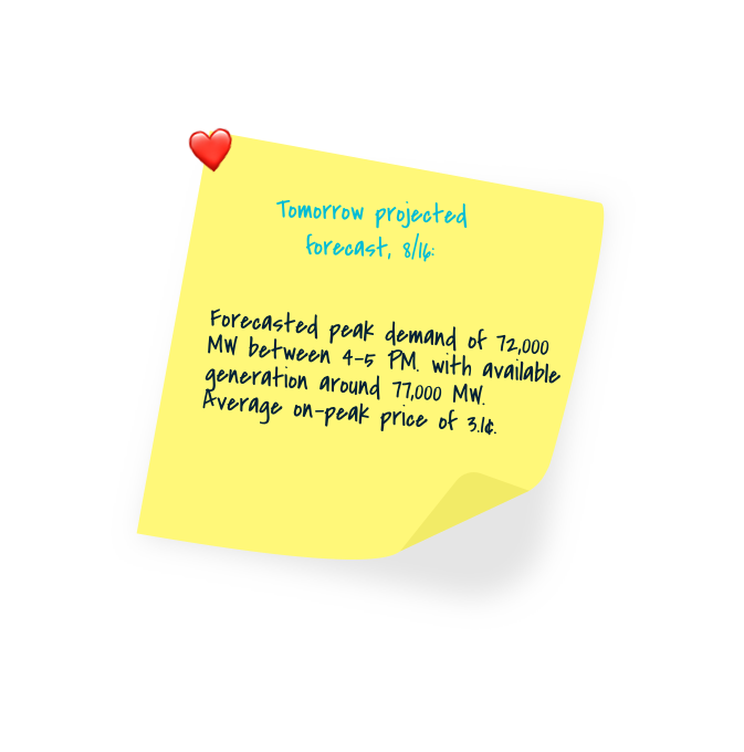 Tomorrow's projected forecast, 8/16: Pricing and conditions are expected to resemble that of Thursday, with an expected highest hourly average 4¢. Rain moving the state is expected to lower overall cooling demand.pic.twitter.com/DsZ1yB9CN7