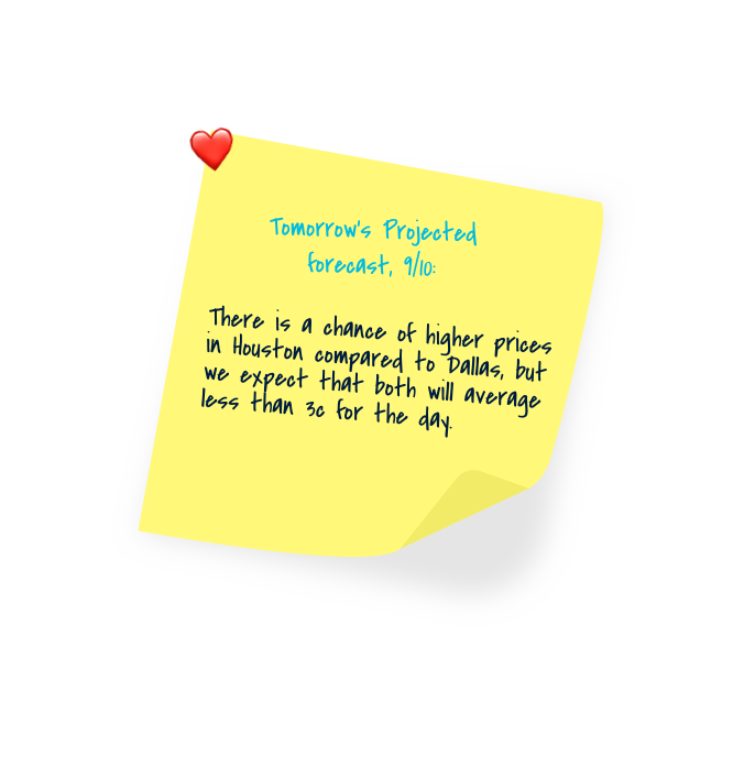 Tomorrow's projected forecast, 9/10: We expect prices to be low throughout the day, especially in the morning. Wind generation is going to fall from recent highs, but it shouldn’t be a concern with lower temperature.pic.twitter.com/mCcpWUR1xA