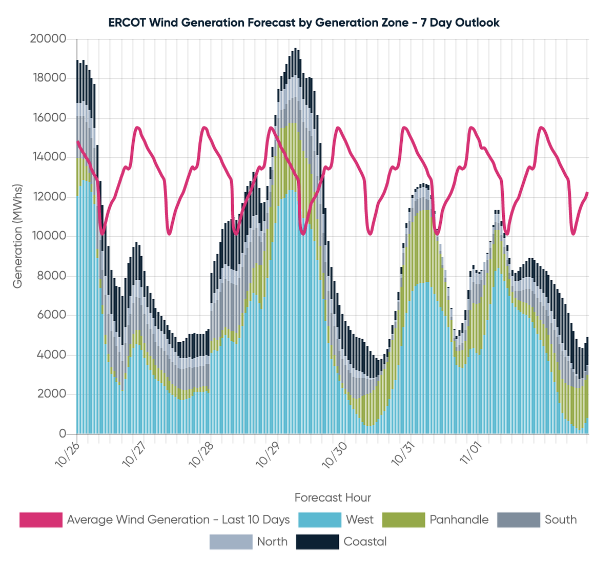 Tomorrow's projected forecast, 10/27: Demand should be lower tomorrow, and the wind forecast is much lower than it was for today, so there is not the same risk from wind generation forecast error from ERCOT that we saw today.pic.twitter.com/h7QfNGCnuv
