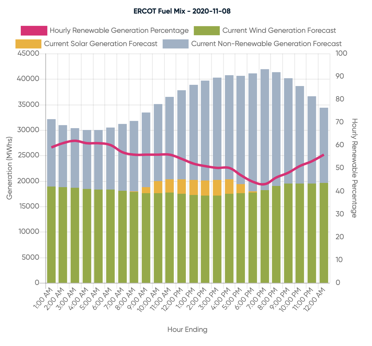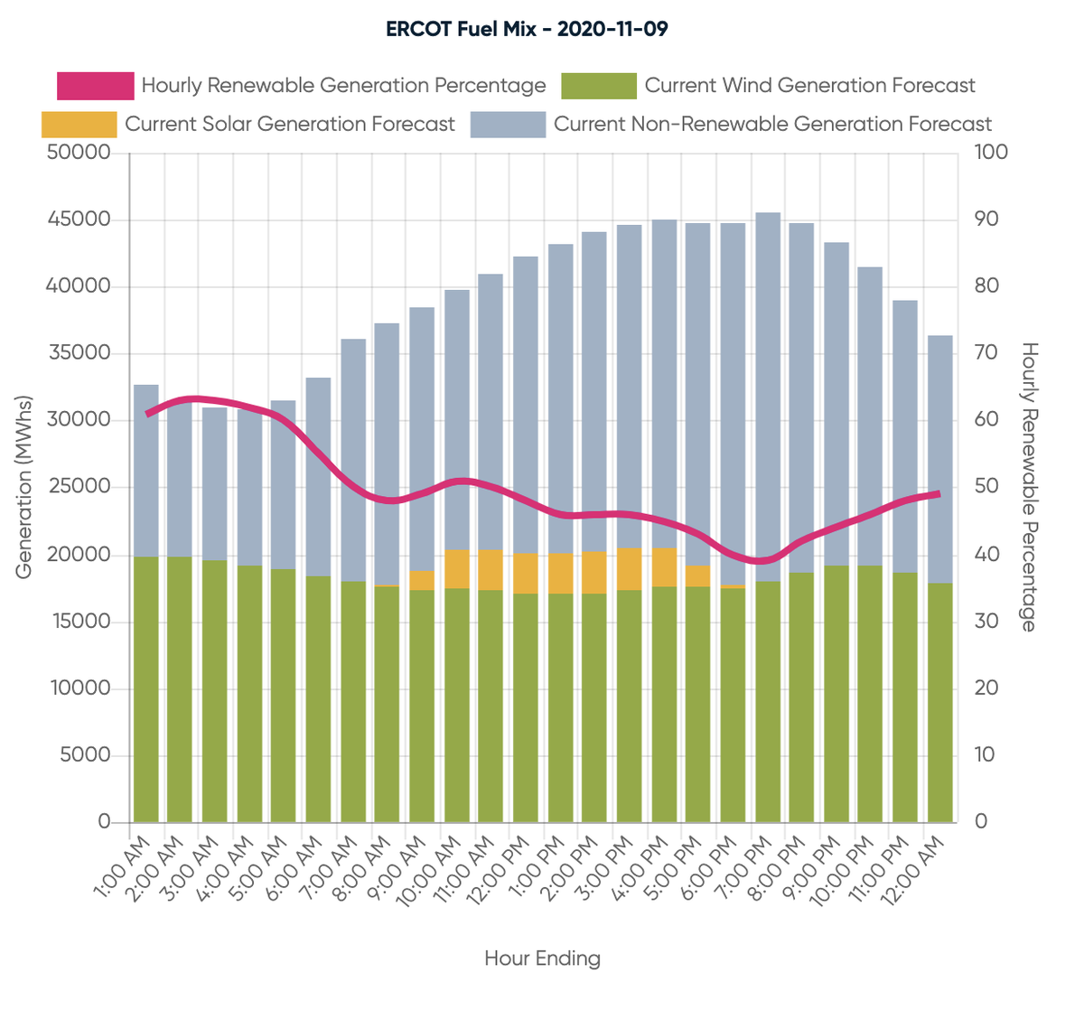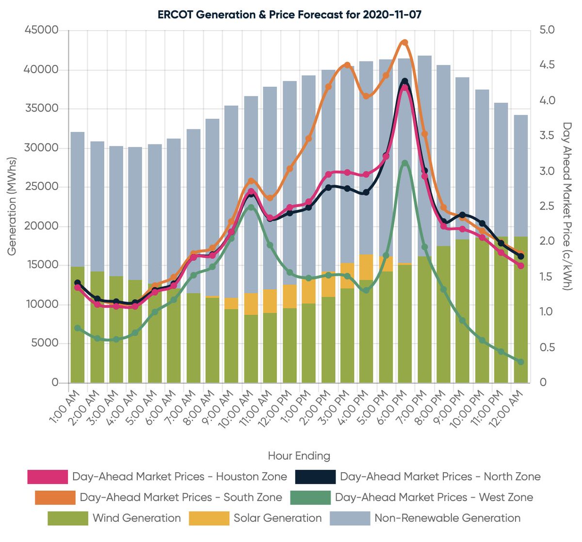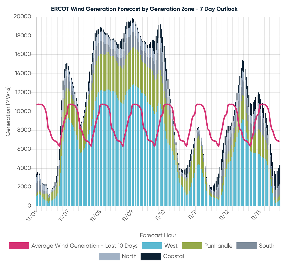 Projected forecast, 11/7, 11/9, 11/9: ERCOT’s forecast shows that wind generation will be significantly higher throughout the weekend when compared with today. Demand is also forecasted to be weaker. We expect pricing to be mild ranging from 1.5¢ - 3¢ through the weekend.pic.twitter.com/f8nun0jJkF