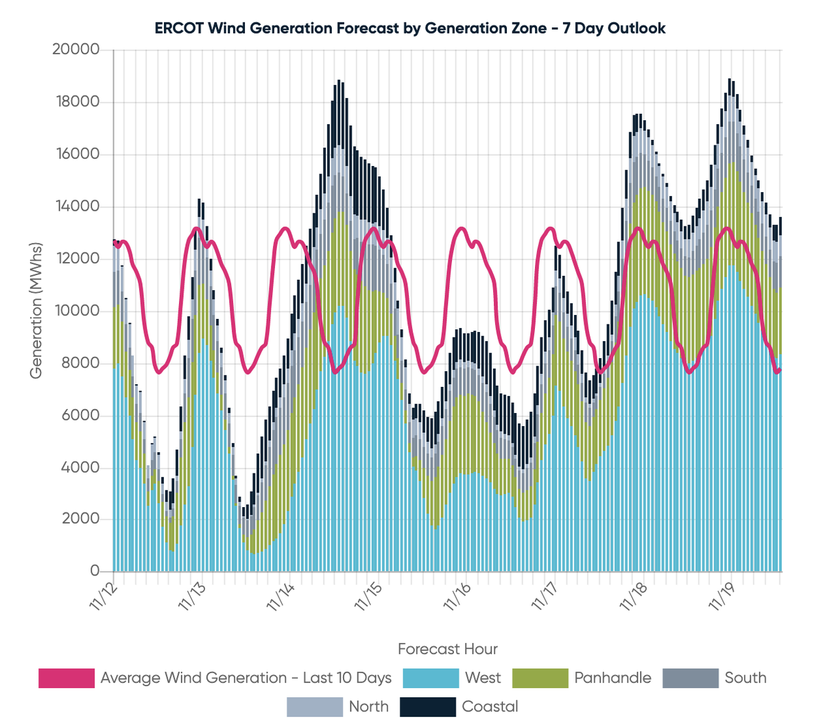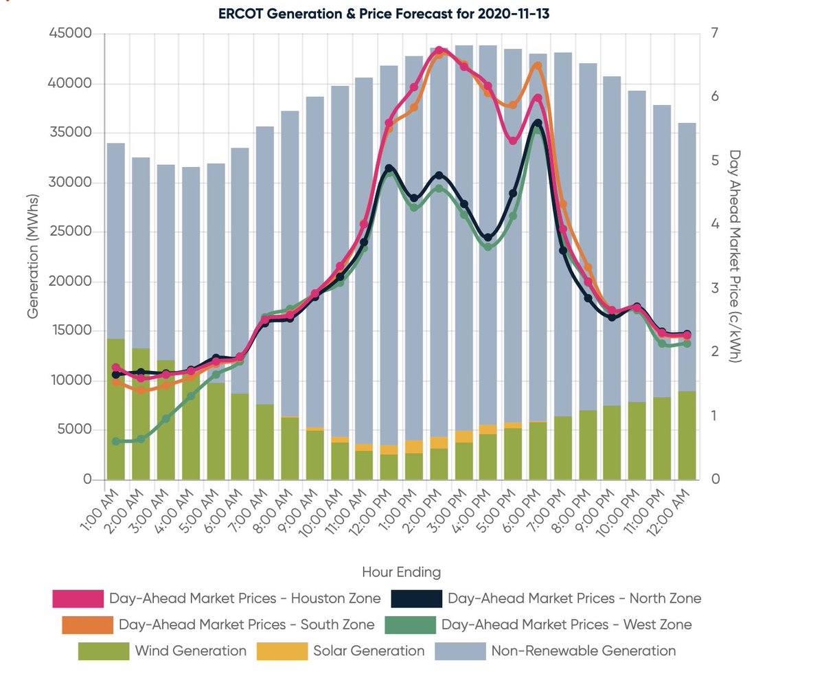 Tomorrow's projected forecast, 11/13: There is some slight risk of elevated pricing in the afternoon peak period tomorrow in the Houston and South zones. Wind is forecasted to be relatively weak again tomorrow, but is forecasted to get stronger into the weekend.pic.twitter.com/rJhSHJa6cd