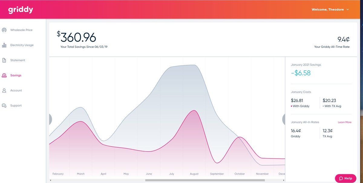 If TX avg is 12.4kWh, then I'm saving roughly 23.6% with @GoGriddy... I also don't mind pre-cooling and pre-heating because I know I'm doing so when the grid is less-stressed. I feel MUCH more environmental, too! Like, I'm going to install a Tesla battery to deal with surges!