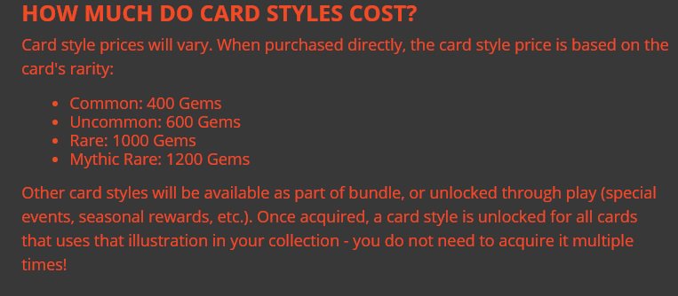 While some card styles are going to be given away as rewards or in events, here's the cost if you want to buy them from the store (you also must own the card for the purchase to really do anything). https://forums.mtgarena.com/forums/threads/53744 … pic.twitter.com/o8L3skEChu