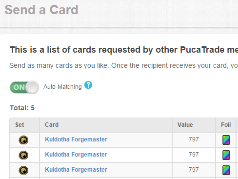 @PucaTrade I flagged the price of foil Kuldotha Forgemaster. Lowest NM on TCG is $15 but point value is 797. Take a look? :)