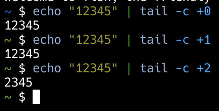 Wait, what? tail -c +2 starts the display at the _second_ byte?pic.twitter.com/rio7R8gEad