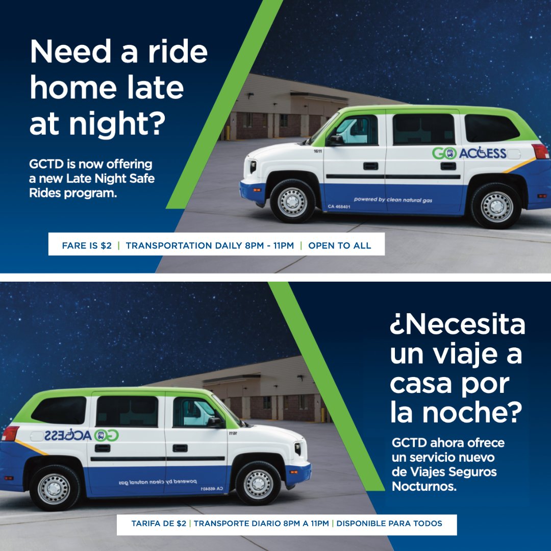 #GCTD continues to offer late night safe rides to help night workers get reliable and safe#transportation from 8 – 11 p.m. Accepting both cash and Token Transit e-fares. Reserve a ride with a minimum 1-hour notice by calling 805-485-2319. Fare is $2pic.twitter.com/X298leAvSd