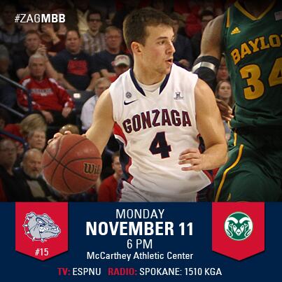 It's Game Day! @ZagMBB will host Colorado St. at 6pm. If you can't make it to the Kennel tune in to ESPNU. Go Zags!pic.twitter.com/WiD0MUHS2e