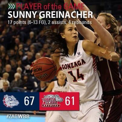 Greinacher adds 17 points to help push @ZagWBB past a tough Santa Clara team 67-61. #ZAGWBBpic.twitter.com/IqPDPo73tq