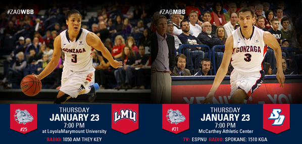 GAMEDAY! @ZagMBB hosts San Diego in the Kennel at 7pm and @ZagWBB hits the road to take on LMU at 7pm. #6thFan #GONZpic.twitter.com/SMf6NDrXXY