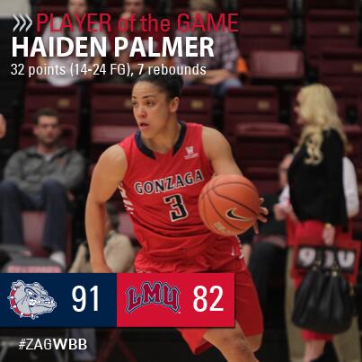 WBB | Career-high 32 points for Haiden Palmer in an impressive @ZagWBB OT winner at LMU! #ZAGWBBpic.twitter.com/3yqixxlMrp