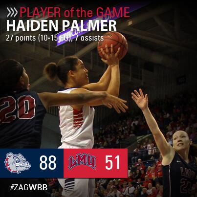 WBB | Senior Haiden Palmer put on another show for @ZagWBB as GU dropped LMU in Spokane! #ZAGWBBpic.twitter.com/1i8JW0EGSP