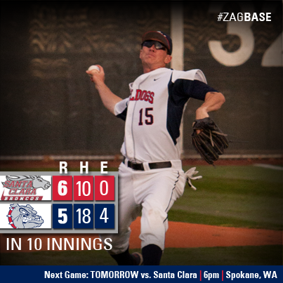In 10 innings, @GonzagaBaseball falls to Santa Clara. Broncos take game one 6-5. #ZAGBASEpic.twitter.com/70Nh1CCP1Z